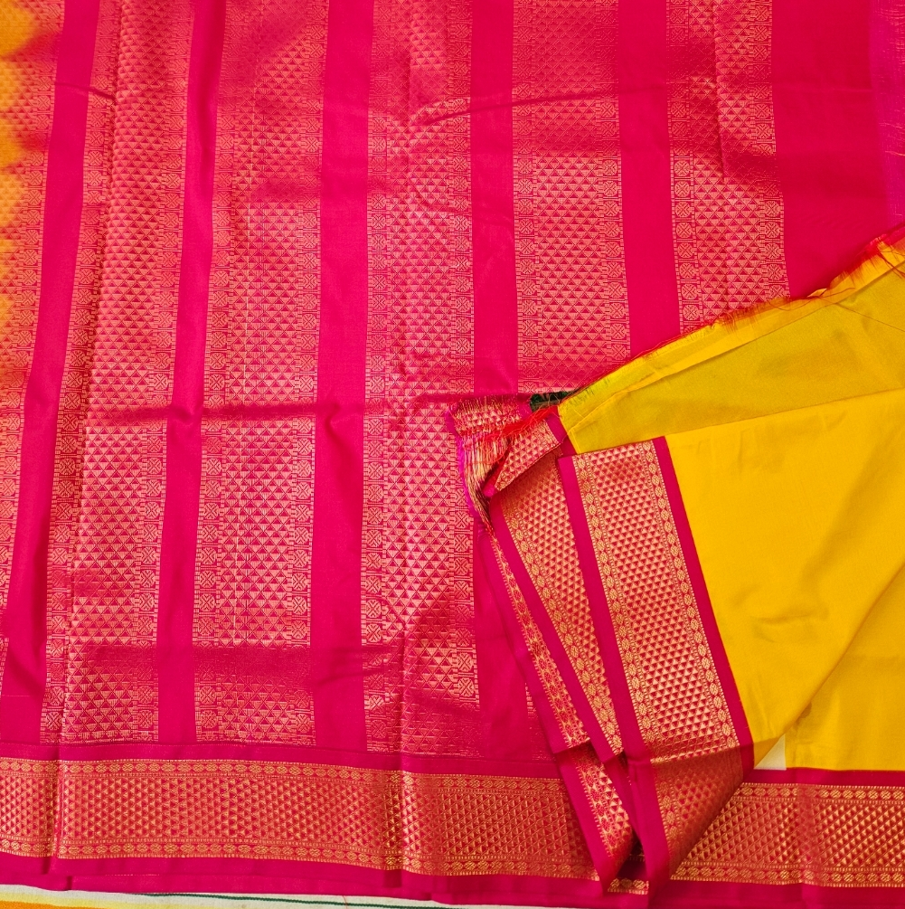 Light yellow with copper and majenta rich pallu which always have grand look in all our traditional functions.There are certain groups still following the traditional color only. Which gives more satisfaction to them as though many new material or design come